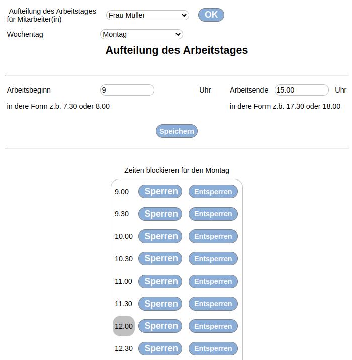 Für jedem Ihrer Mitarbeiter(innen) wird ein Tagesplan angelegt, in dem die Arbeitszeiten von - bis eingetragen werden.