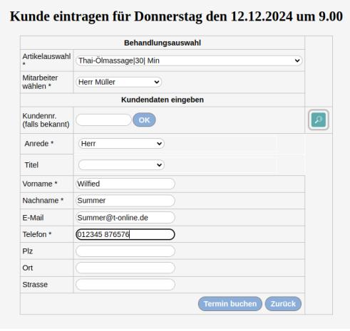 gewünschtes Datum aus dem Kalender anklicken. Danach öffnen sich die Tagespläne Ihrer Mitarbeiter(innen). Klicken Sie auf das Pluszeichen und Sie gelangen ins nächste Formular um die Kundendaten einzugeben.